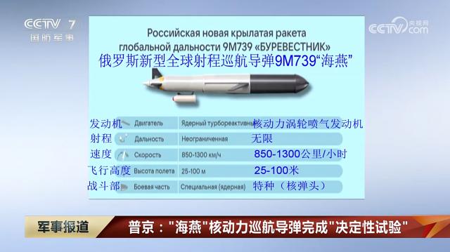 目前,关于"海燕"导弹的公开信息仍然极为有限。俄方公开过该型导弹的正式名称曾有 9M730 和 9M739 两种,北约将其为"天坠"(Skyfall)。许多西方专家对此项目实用性持怀疑态度,认为这种核动力发动机(相当于用微型核反应堆取代涡喷发动机的燃烧室)可靠性很差,而且存在安全隐患;许多分析人士认为,2019 年 8 月俄罗斯北德文斯克附近试验场的一次放射性事故,即与"海燕"有关。
